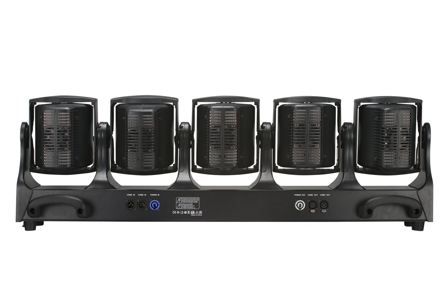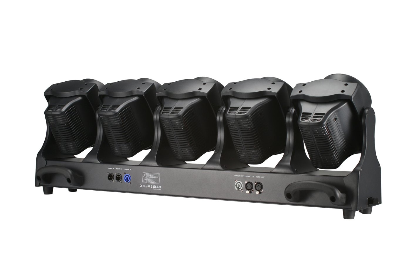 Innovative design multi head effect, powerful 5 x 120W RGBL 4in1 LEDs pixel control, Outer Circle LEDs: 120 x 0.5W RGB 3in1 LEDs, 3leds section control, individual light pan and tilt heads, linear zoom: 3.5°-30, strobe effect with variable speed, 16 bit linear dimmer, 4 selectable dimmer curves,